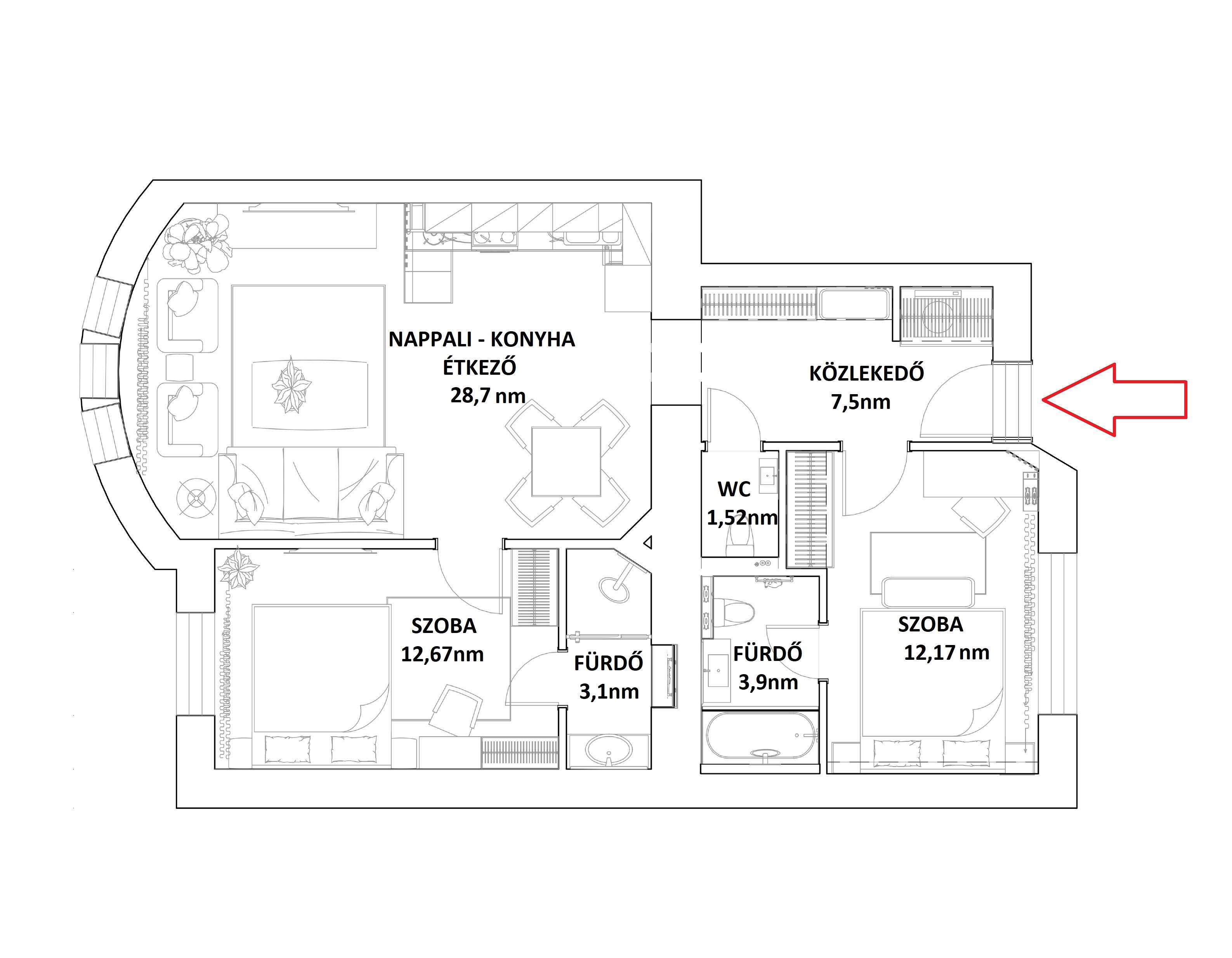 VII. kerület Dohány utcában eladó egy 70 m²-es, teljes körű felújítás alatt álló lakás, amely nappaliból, két hálószobából, két fürdőszobából és külön WC-ből áll. Az alaprajz praktikus, jól használható: amerikai konyhás nappali – étkező tágas, központi térként szolgál, a két hálószoba pedig egymástól szeparáltan helyezkedik el.