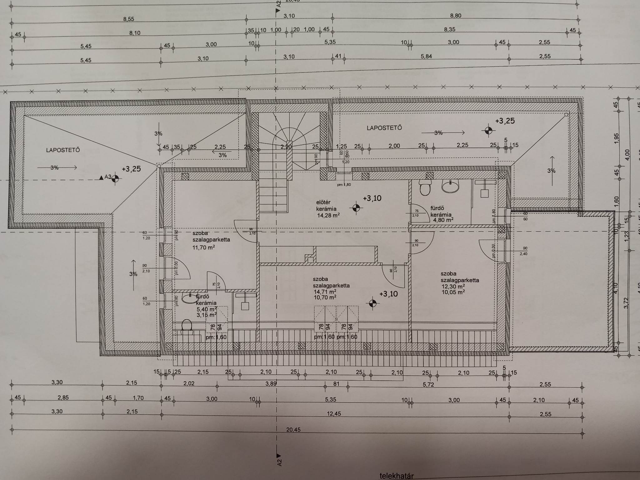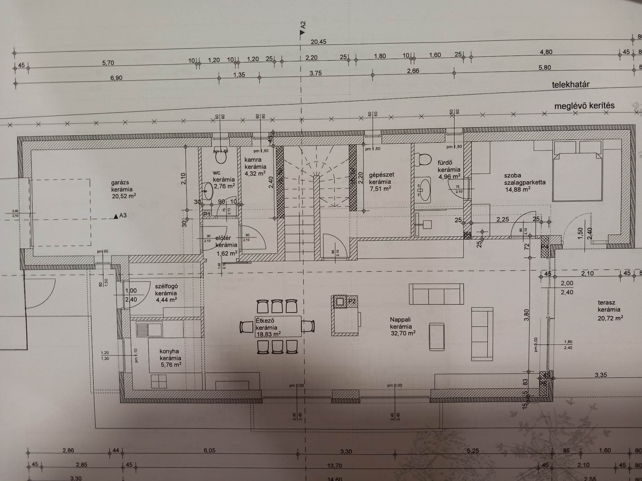 Térbeosztása: telek: 681 m2, lakóépület: 178 m2, földszinti terasz: 21 m2, emeleti teraszok 32 m2, 18 m2